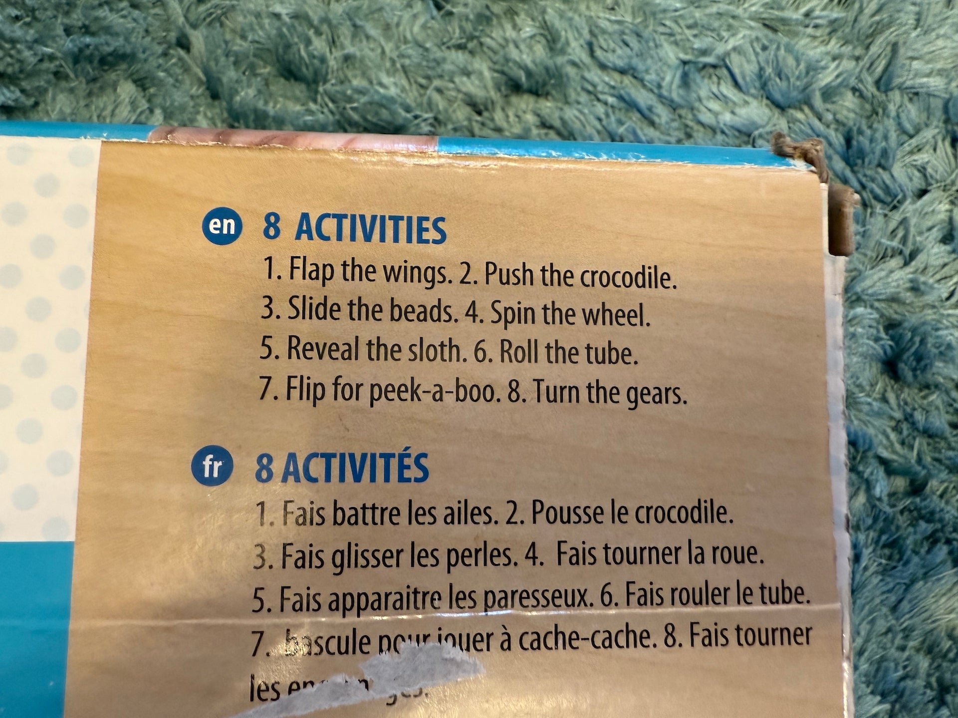 JUNGLE-THEMED ACTIVITY PLAY TABLE: Our wooden table for kids features bright colours, bold patterns, and a whimsical design. The attached pieces are designed to turn, roll, flip, spin, slide, and more.